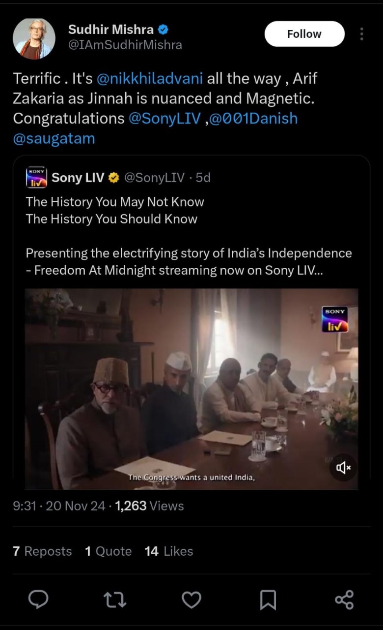 குறிப்பிடத்தக்க பாராட்டு மகாத்மா காந்தியின் கொள்ளுப் பேரன் துஷார் காந்தியிடமிருந்து கிடைத்துள்ளது. இது பற்றி அவர் தனது எக்ஸ் தளத்தில், “சோனி லைவ் ஓடிடி தளத்தில் ‘ஃப்ரீடம் அட் மிட்நைட்’ படம் பார்க்க ஆரம்பித்தேன். பாபு, பண்டிட் நேரு மற்றும் இந்துத்துவா பற்றிதான் கதை இருக்கும் என்று நினைத்தேன். ஆனால், நான் நினைத்தது எவ்வளவு பெரிய தவறு என்று பின்னர் உணர்ந்தேன். ஒரு விஷயத்தில் முன்கூட்டிய முடிவு இல்லாமல் இருக்க வேண்டும். நிச்சயம் நீங்கள் எல்லோரும் இந்தப் படத்தை பார்க்க வேண்டும் என்று விரும்புகிறேன்” எனத் தெரிவித்துள்ளார்.