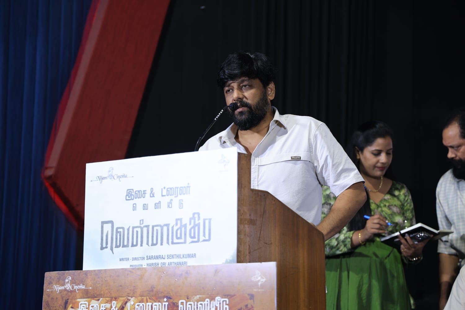 திரு குகன் அவர்கள் பேசுகையில் வெள்ள குதிரை படத்தில் இருக்கும் புது தொழில்நுட்பக் கலைஞர்கள் அனைவறையும் வரவேற்கிறேன். வெள்ள குதிர படத்தை பொருத்தவரையில் அது பெற்றிருக்கும் விருதுகள் அனைத்து தேசத்திலும் ஒருமித்த கருத்தை காண்பிக்கிறது. ஒரு நல்ல திரைப்படம் தனக்கு என்ன வேண்டுமோ அதை தானாக எடுத்துக் கொள்கிறது என்பதை நான் நம்புகிறவன். அந்த மாதிரியான ஒரு நல்ல திரைப்படம் தான் வெள்ளகுதிர. வணிகத்தை தாண்டி ஒரு நல்ல திரைப்படத்தை மக்களிடம் கொண்டு சேர்ப்பதில் பெருமைப்படுகிறோம்